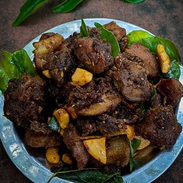 Bone-in mutton pcs shallow fried in coconut oil, Kerala spices, shallots, crushed black pepper, curry leaves.